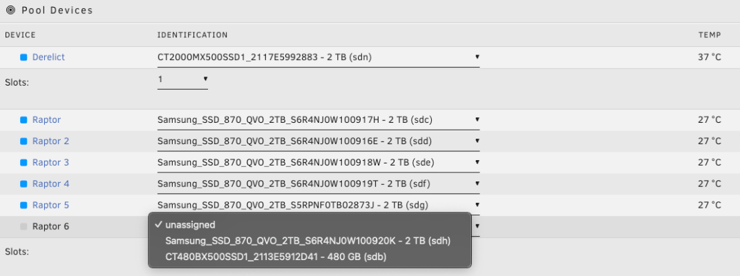 Planifiez la disposition de votre pool pour répondre à vos besoins et à votre croissance future. Contrairement à l'array d'Unraid, vous ne pouvez pas ajouter un seul disque à un vdev existant en utilisant le WebGUI.